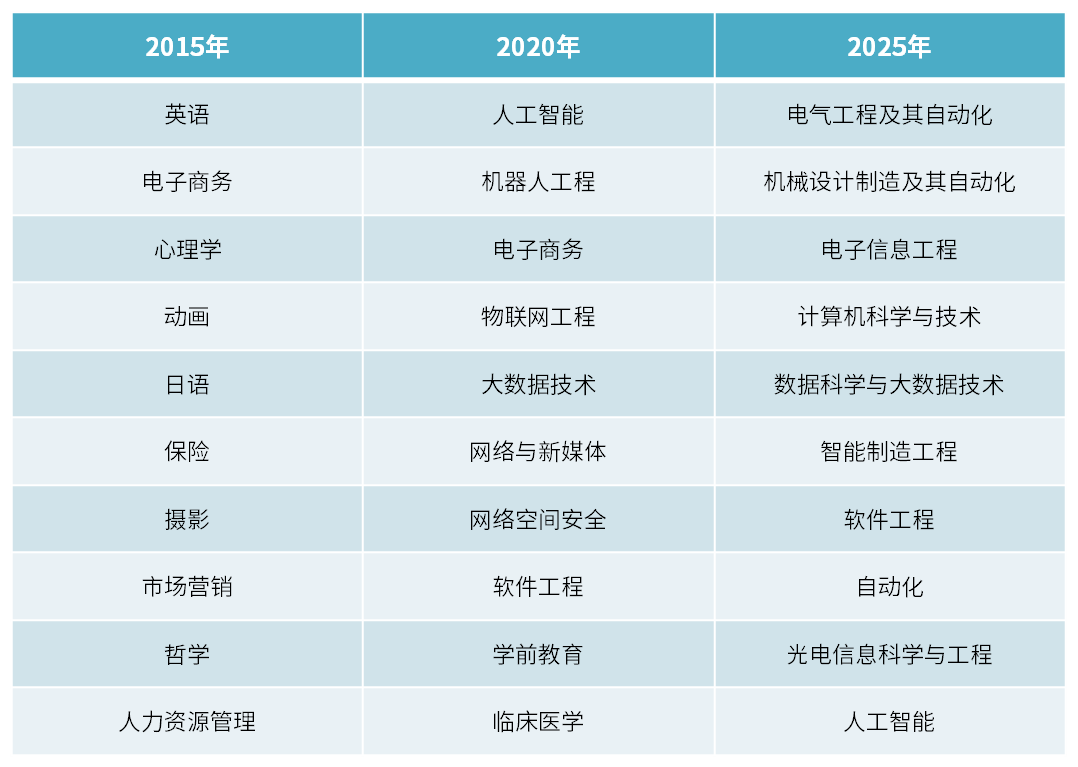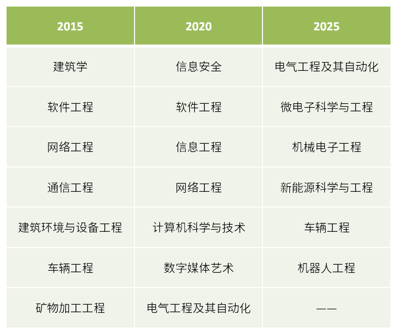 按照麦可思研究院的数据来看,近十年间的绿牌专业(绿牌指的是就业对劲度高的需求增加型专业)根基均为工科专业,但具体的专业标的目的有些微妙的变化。正在2015年、2020年均上榜的软件工程、收集工程消逝正在本年的榜单上;电气工程及其从动化正在2015年未上榜,但正在近五年却连结着不错的位次。