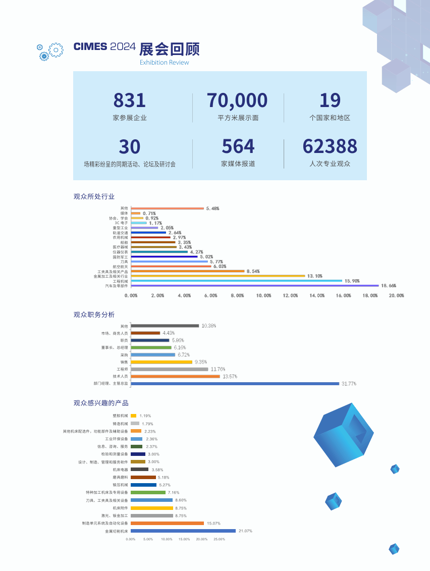 不雅众画像阐发:参不雅不雅众来历高度集中于焦点使用行业,此中汽车及零部件行业占比 18。6%,金属加工行业占比 15。9%,航空航天行业占比 13。1%。不雅众群体中,部分司理及以上办理人员占比 31。7%,专业手艺人员占比 13。5%,焦点决策人群取手艺人才占比凸起,无效保障了展会的商贸对接取手艺交换价值。