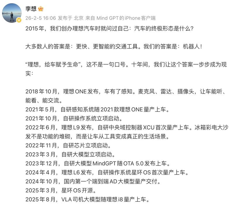 易车讯 2月5日,抱负汽车CEO李想正在社交上暗示,2026年,即将到来的全新抱负L9不只是一台好车,更是具身智能机械人的开山之做。我们预备了十年,据悉,全新将于3月送来正式上市。500)this.width=500 align=center hspace=10 vspace=10 rel=nofollow/>500)this。width=500 align=center hspace=10 vspace=10 rel=nofollow/500)this.width=500 align=center hspace=10 vspace=10 rel=nofollow/>500)this。width=500 align=center hspace=10 vspace=10 rel=nofollow/李想暗示,2015年,我们开办抱负汽车时就问过本人:汽车的终极形态是什么?大大都人的谜底是:更快、更智能的交通东西。我们的谜底是:机械人!李想还暗示,这两年有良多人问我,是不是all in AI就不关心汽车了。恰好相反,我们深知:具身智能必需长正在一台好车上,所以我有70%的时间聚焦正在汽车上,这让我们更领会若何让车进化成实正的机械人。即将到来的全新抱负L9,车成为智能体。眼睛、大脑、心净、神经、四肢举动——完整的手艺栈让车从被动东西变成自动伙伴。它会认出你,理解你,自动办事你。将来,每个家庭都值得具有如许的智能伙伴。2026年,抱负第二个十年。全新抱负L9,不只是一台好车,更是具身智能机械人的开山之做。我们预备了十年,就等这一刻。 全新抱负L9此前动静回首500)this.width=500 align=center hspace=10 vspace=10 rel=nofollow/>500)this。width=500 align=center hspace=10 vspace=10 rel=nofollow/外不雅方面,全新抱负L9全体延续了现款车型的制型设想,全体极具辨识度。然而有个细节值得留意,那就是这款车疑似用上了后向,可以或许较着看到转向角。500)this.width=500 align=center hspace=10 vspace=10 rel=nofollow/>500)this。width=500 align=center hspace=10 vspace=10 rel=nofollow/内饰方面,从此前谍照来看,新车标的目的盘采用了全新的设想,但打消了标的目的盘上的交互屏,手动空调出风口变成了i6同款的从动出风口。同时,新车保留了现款的大连屏。按照此前的动静称,抱负自研智驾芯片M100即将初次上车L9。座舱芯片也将切换至高通新一代车载芯片8797。此外,新车正在底盘上会有全新升级,增程电池电量也将跨越70度。